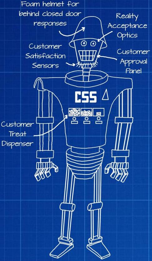 Over the years, this team has gone by many names (from Field Services to Enterprise Technical Support Services). However, when this robot came into being, the team was known as Customer Support Services or CSS. Therefore, he was dubbed with the moniker of Casius, and given some of the physical attributes of the team’s director at the time. Casius was built with only the basic features and functionality of a customer support person, from his foam helmet for behind closed-door responses (i.e. screaming into it or banging his head on wall), to the Reality Acceptance Optics for eyes, which equates to a wartime 1000 yard stare after experiencing too much time in the trenches. He is also fitted with a Customer Approval Panel for a mouth, which is created in a perpetual smile, so no customer ever witnesses anything other than happiness at the opportunity to serve them. Customer Satisfaction Sensors are built into the beard and have a direct tie into the Customer Treat Dispenser built into his chest. Working in conjunction, they allow Casius to provide different qualities of treats (which may or may not include a small sedative) to the customer based on their feedback of the quality of service rendered. When going into an especially hostile environment (think one minute before a meeting starts and the conference room A/V is not working), Casius has the ability to lower his entire head into his body to avoid the glowering eyes of the customers. |